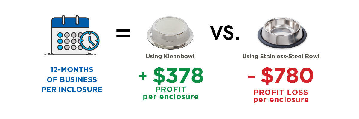On average, this generates them $21 in extra profit per enclosure per month or $252 extra per year. To cover the initial cost of switching over to Kleanbowl, a typical Kinn client can charge $1 extra a day per pet guest stay, generating an additional $30 a month per enclosure.